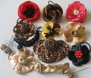 Среди аксессуаров для волос можно выделить такие, как обручи, резинки, шпильки, заколки, зажимы, ленты. Пожалуй, самыми популярными были и остаются аксессуары в виде цветков. Кроме того они могут быть украшены бусинами, стразами, бантиками, жемчугом, бархатом и многим другим.